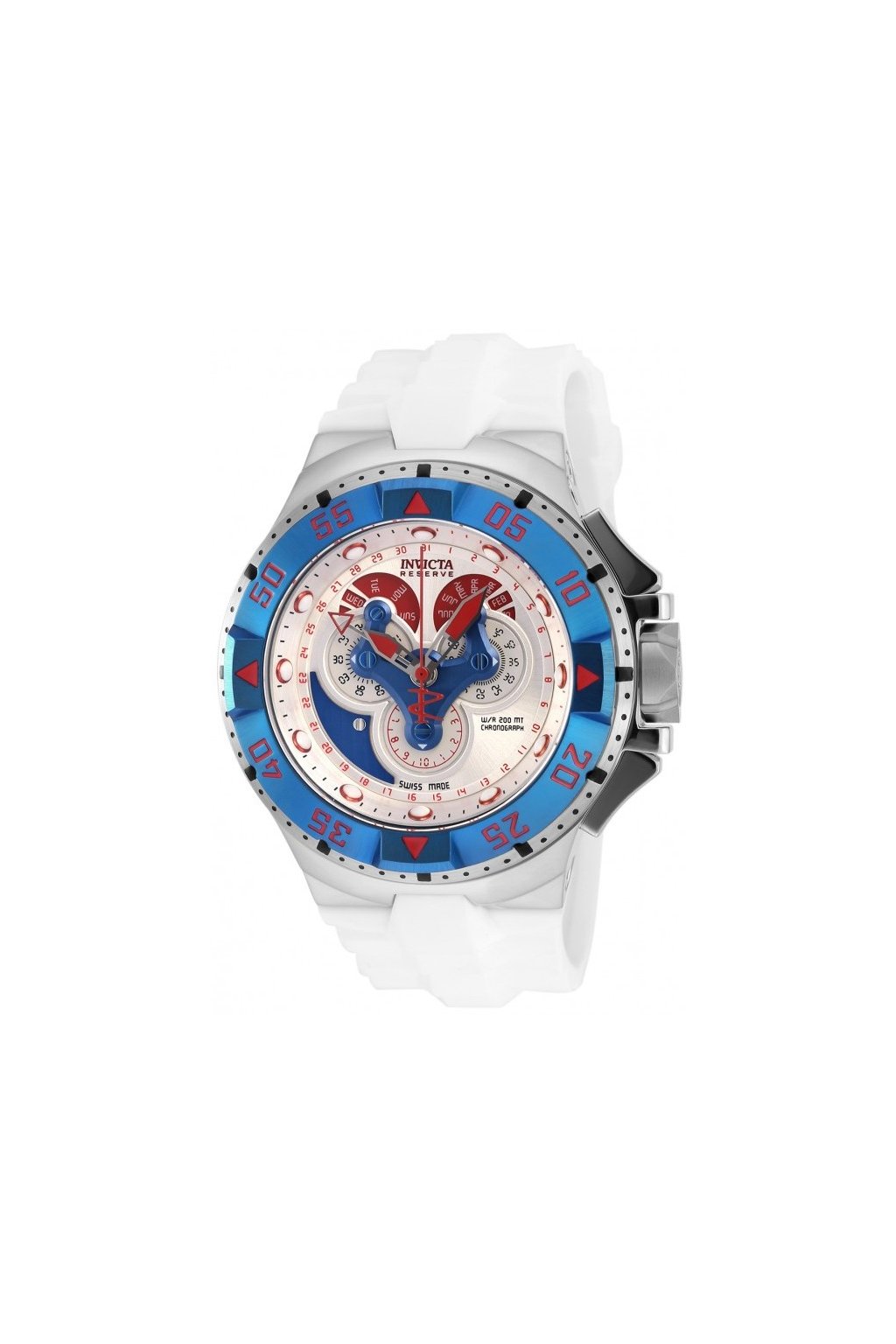 Swiss made Strojek: švýcarský quartzový strojek Ronda s chronografem Pouzdro: průměr 50 mm, ocelové pouzdro, pevná luneta s modrým ionizovaným povrchem a červenými indexy Sklíčko: Flame fusion - antireflexní minerální sklo se safírovou vrstvou odolnou proti oděru Korunka: šroubovací a tlačítka Číselník: Superluminiscenční ručky a indexy, indikace dne a měsíce, stříbrný ciferník Pásek: bílý silikonový a ocelová spona Voděodolnost: 200m