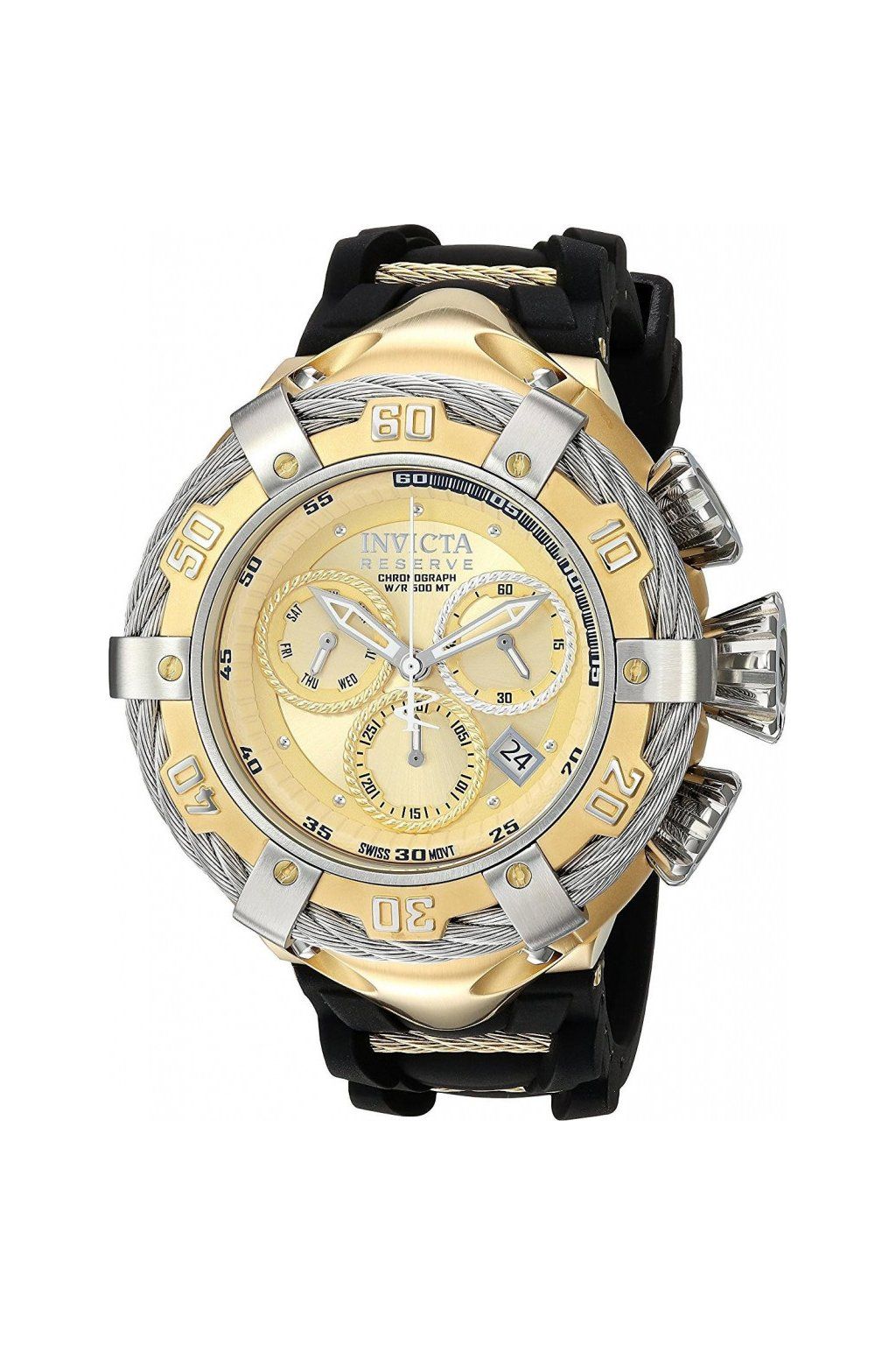 Swiss made, průměr pouzdra 54,5 mm, voděodolnost 500 m Strojek: švýcarský quartzový strojek Ronda s chronografem Pouzdro: průměr 54,5 mm, z nerez oceli se žlutým zlacením, ocelové lanko okolo pevné lunety Sklíčko: Flame Fusion - antireflexní minerální sklo se safírovou vrstvou odolnou proti oděru Korunka: šroubovací Číselník: luminiscenční ručky, datum, zlacený ciferník Pásek: siliconový černý pásek se zlacenými detaily a spona Voděodolnost: 500m